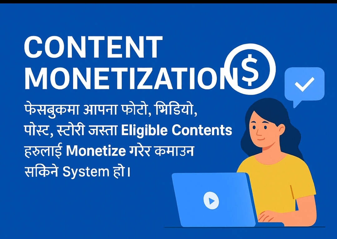 Content Monetization फेसबुकमा आफ्ना फोटो, भिडियो, पोस्ट, स्टोरी जस्ता Eligible Contents हरुलाई Monetize गरेर कमाउन सकिने System हो।